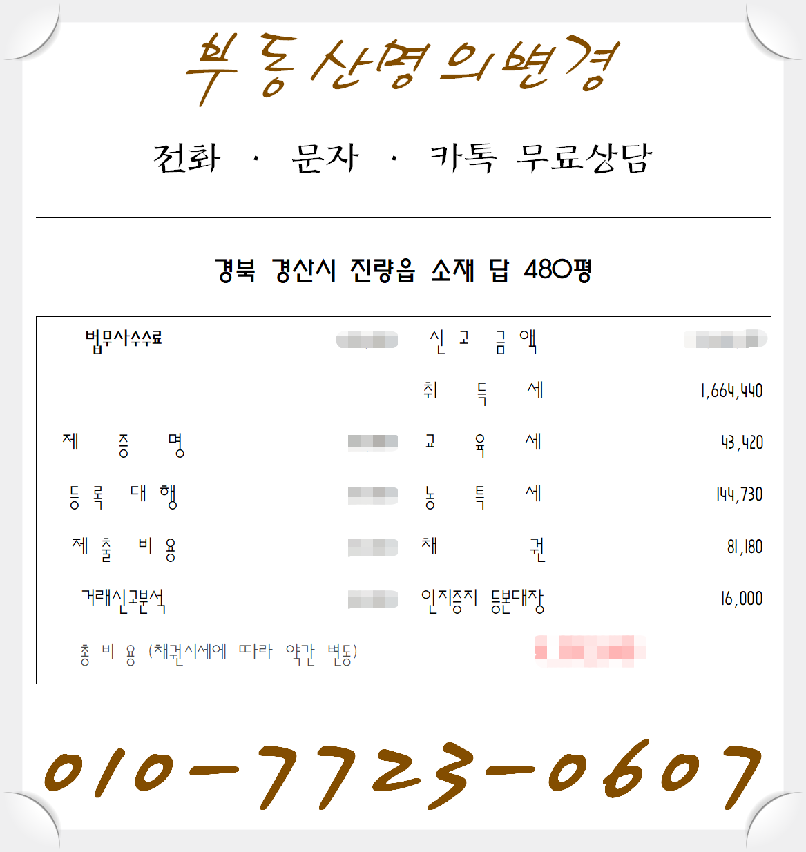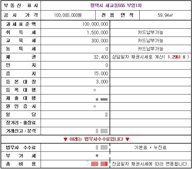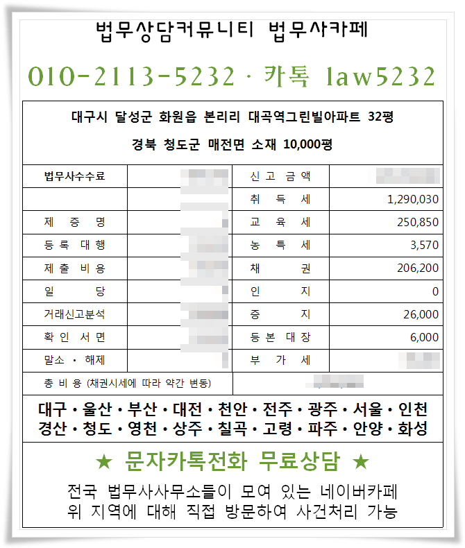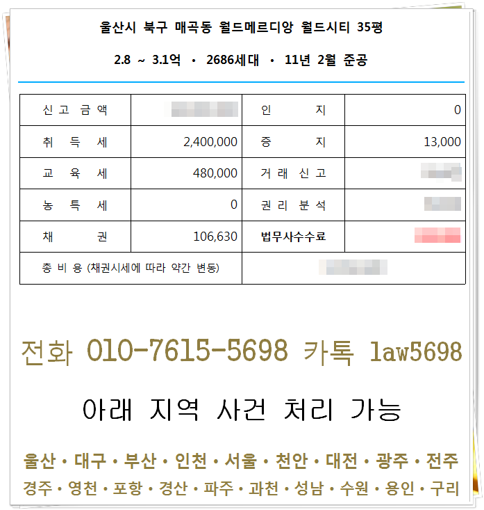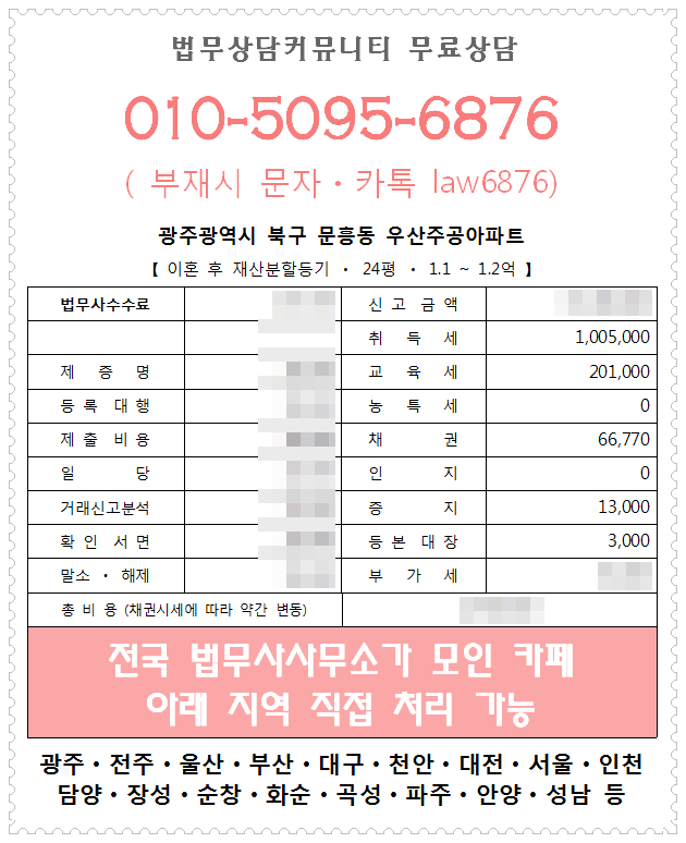 이혼재산분할금액 기준 납세확정 시 시가 1000~1억5000만원일 때 이혼재산분할 취득세 등 등기관련 세금은 총 260~400만원, 2~3억원 이혼의 경우 약 520~760만원 이혼은 분할되는 부동산의 가치에 따라 세금의 크기가 달라지게 됩니다. 서울, 인천, 파주, 안산, 군포, 용인, 성남, 천안, 세종 등 동일하게 적용 가능하며, 방문시 서울, 인천, 부산, 대구, 울산, 광주, 세종 등 현지법무법인에 직접 연락하시면 됩니다. 협의이혼재산분할취득세 기타 등기관련세는 한국정부가 신고하여 수탁자(수취인)에게 지급하며, 재산분할계약의 내용은 과세됩니다.