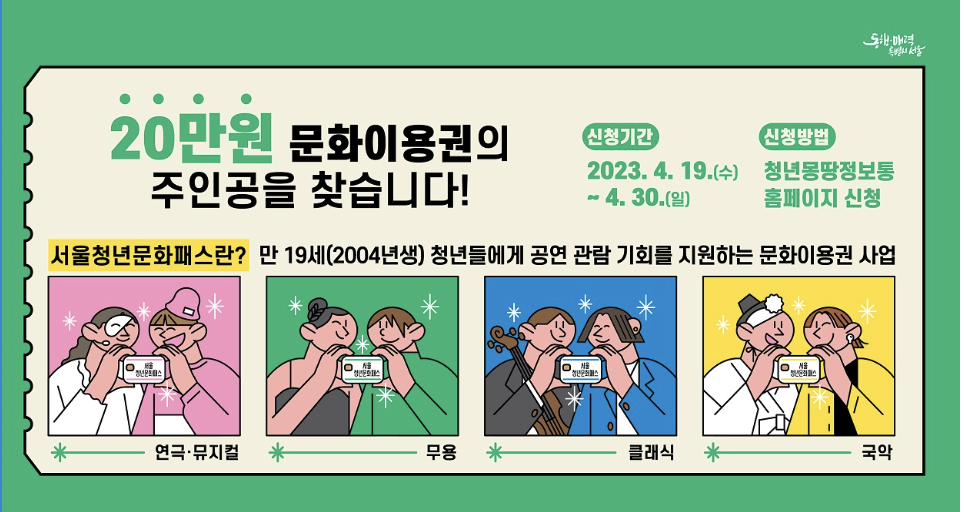 서울청소년문화패스 4월 19일 9시부터 4월 30일 18시까지 청소년종합정보 홈페이지에서 신청할 수 있습니다.