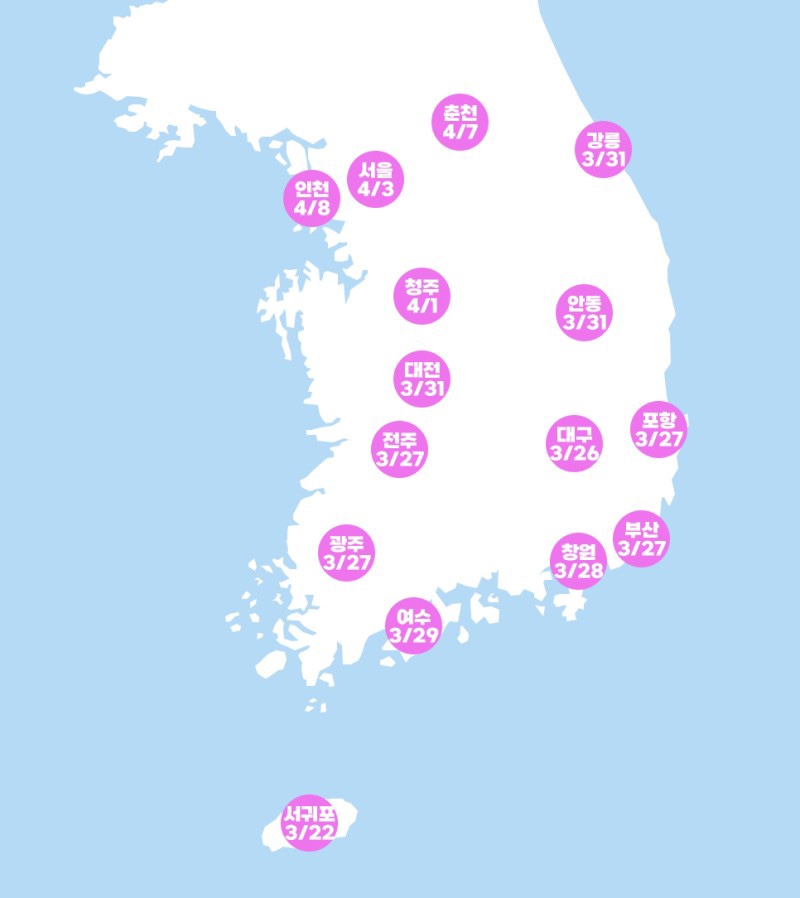 최근에 일교차는 거의 20도. 일부 지역에서는 아침 기온이 영하로 떨어지다가 서리까지 내리기도 했지만, 반대로 낮에는 기온이 오르며 더위를 느낄 수 있었습니다. 이에 지자체들은 벚꽃축제 시기를 앞당기고 있다. 사진 속 날짜를 참고하셔서 아무 탈 없이 벚꽃 여행을 떠나보세요.