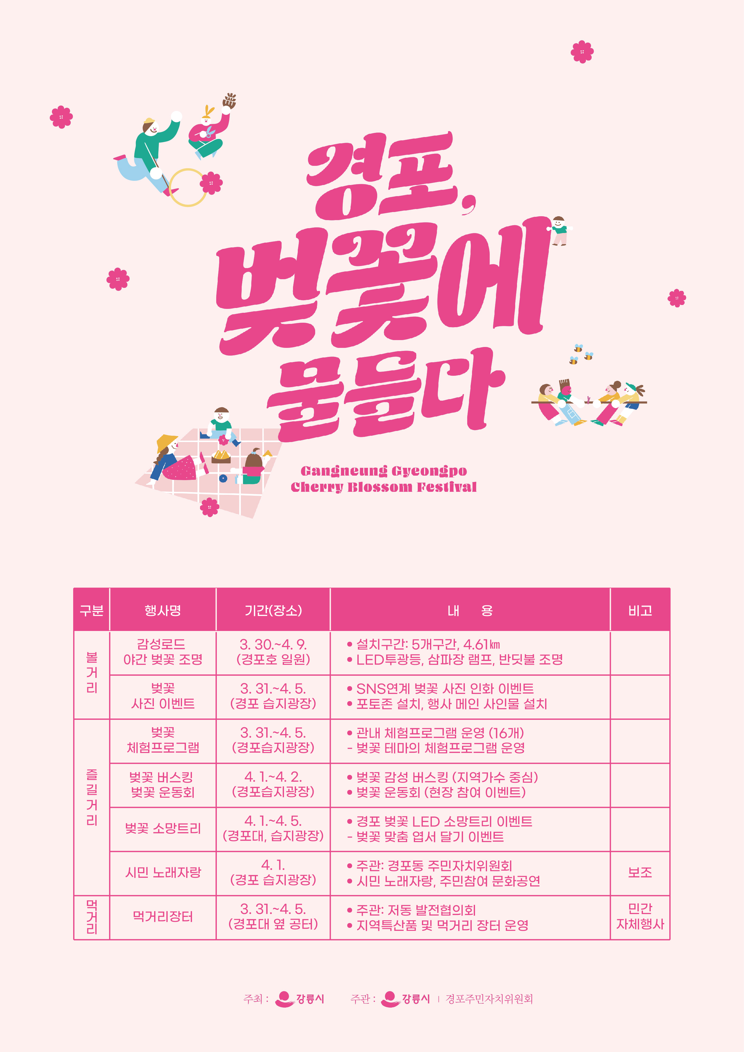 3월 30일부터 4월 9일까지 이용 가능 벚꽃 감성 하중은 1입니다. 경포교차로 ~ 홍조장암, 2. 경포천 삼일기념탑 연결된 4월 1일부터 2일까지 벚꽃 정취가 물씬 풍기는 거리 음악과 가족과 함께 즐거운 운동회를 즐길 수 있습니다. 축제 시간 항상 즐기십시오 벚꽃 체험 평일 오후 12시~오후 6시, 주말 오전 10시~오후 6시까지 진행되며 벚꽃을 주제로 한 작품을 선보인다. 치유 경험 공예체험을 통해 더욱 알찬 축제를 경험할 수 있습니다.
